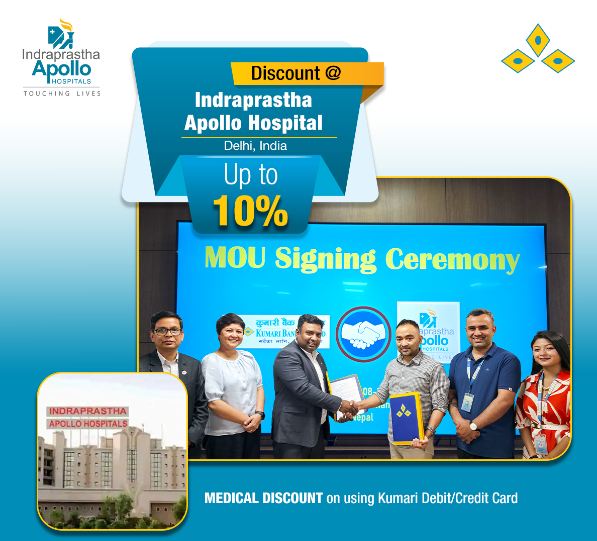 कुमारी बैंकका ग्राहकले नयाँ दिल्लीस्थित इन्द्रप्रस्थ अपोलो अस्पतालमा १०% सम्म छुट पाउने