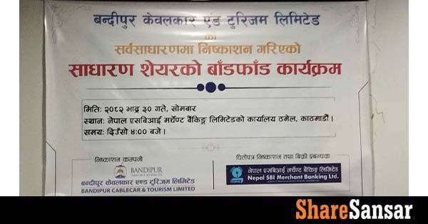 भदौ ३० गते, सोमबार बन्दीपुर केवलकार एण्ड टुरिजम लिमिटडको आईपीओ बाँडफाँट भएको छ । कम्पनीको शेयर निष्काशन तथा बिक्री प्रबन्धक नेपाल एसबिआई मर्चेन्ट बैंकिङ्ग लिमिटेडको कार्यालयमा कम्पनीको आईपीओ बाँडफाँट भएको हो ।