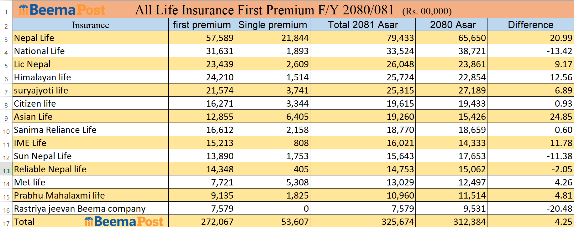 काठमाडौं । गत आर्थिक वर्ष अर्थात भर्खरै सकिएको आव २०८०।०८१ मा जीवन बीमा कम्पनीहरुको प्रथम बीमा शुल्क सामान्य अंकले